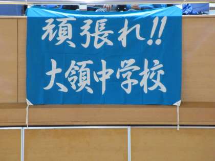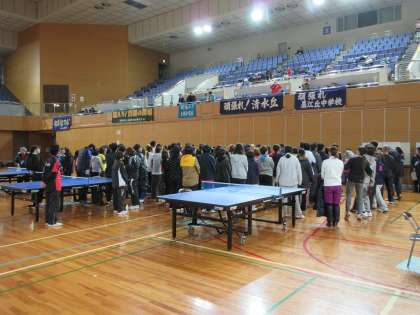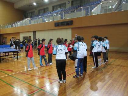 「頑張れ!!大領中学校」の旗のもと、1月24日(日)住吉スポーツセンターで住吉区PTA卓球大会が開催されました。開会式の後、大領中学校は清水丘小学校と対戦し、見事に勝ちました。