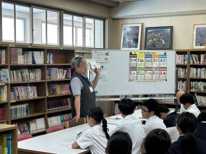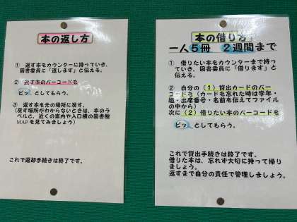 4時間目、1年生が図書室で司書の先生から図書室の使い方など学んでいました。