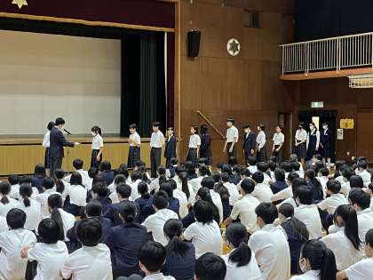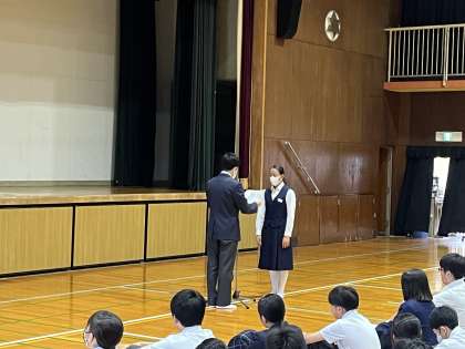 体育大会で着る教職員Tシャツのデザイン応募を行ったところ、たくさんのデザインの応募がありました。そこで、応募してくれた生徒に、生徒会から感謝状を贈呈しました。また応募の中からTシャツデザインに選ばれた三年生の生徒には、最優秀デザイン賞が贈られました。