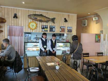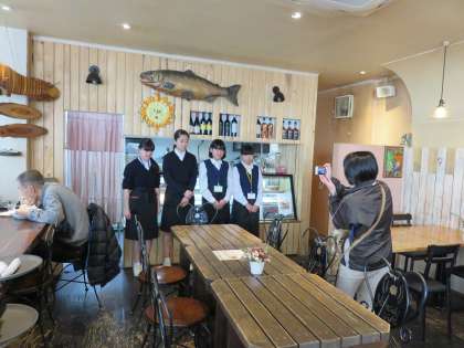ヤマダカフェでは4人の生徒が接客とともに厨房でも作業を体験させていただきました。見学のついでに食事をさせていただきましたが、初体験の接客ではとても緊張しているなと感じました。仕事の難しさも学んでください。学校にいる時と比べてどうですか、働くことはとてもしんどいですね。