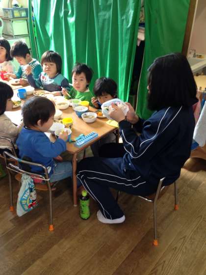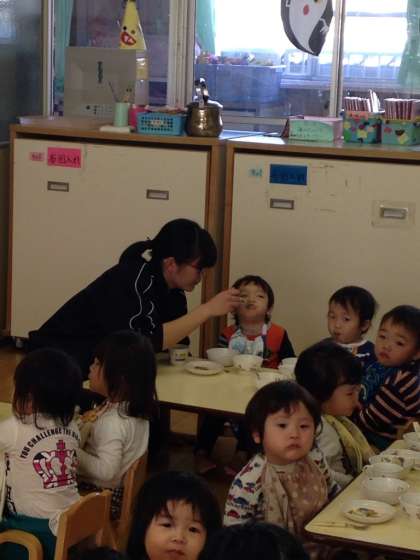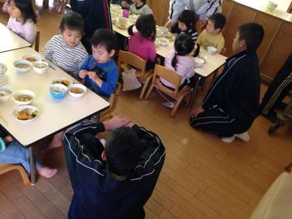見学に行った時は、昼食の時間でした。かわいい園児たちとともにいてもとても緊張している様子がうかがえます。