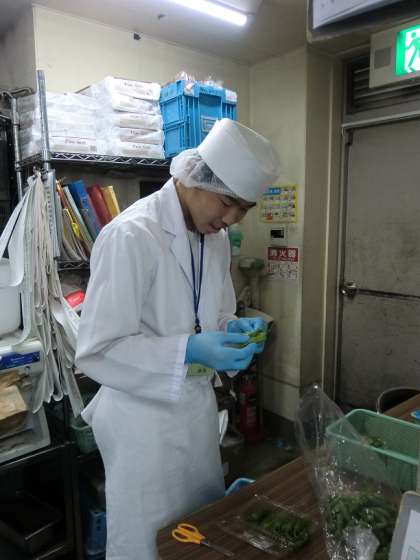 装束を整えてししとうのへたを一生懸命に取っていました。