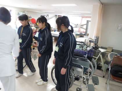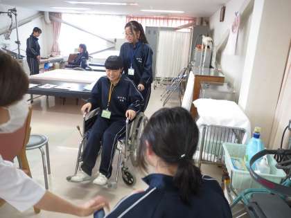 病院の仕事について真剣な様子でお話を聞いていました。また、車椅子での体験もさせていただきました。