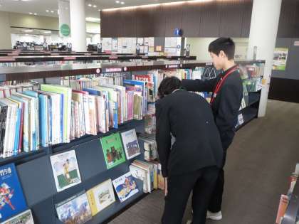 住吉図書館では男子の生徒4名が2人づつコーナーに分かれて本の置かれている場所が正しいか。また、本を正しい場所に収める仕事をしていました。図書館の仕事はとても根気のいる仕事です。よい経験になったのではないでしょうか。