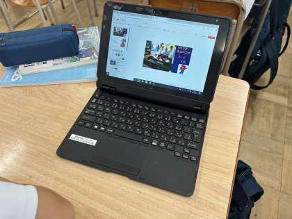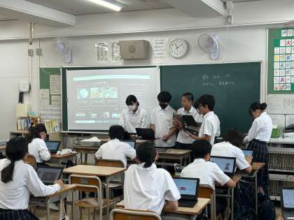 2年生が万博での学習のまとめの発表を練習しています。パワーポイントで画面を提示し、班ごとに調べたことなどを発表します。