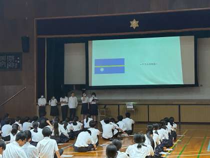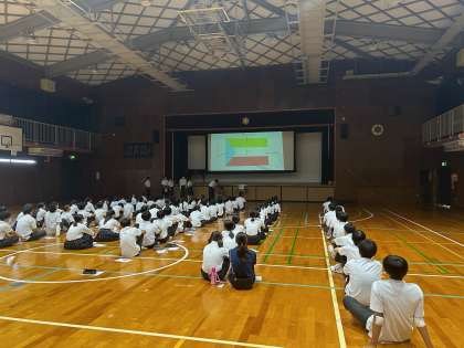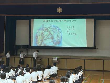 5時間目、2年生が調べ学習の発表会を体育館で行いました。堂々と発表しています。