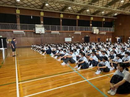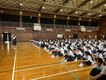 全校集会を行いました。80年、沖縄戦、慰霊の日です。深く考えながら学びましょう。