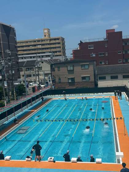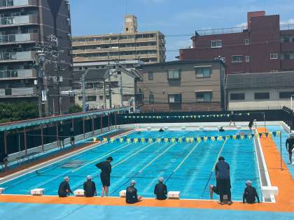 3時間目、お天気の中、プールでがんばっている3年生です。
