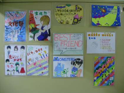 各クラス、クラブの宣伝ポスターも完成し、昨日より渡り廊下での掲示が始まりました。