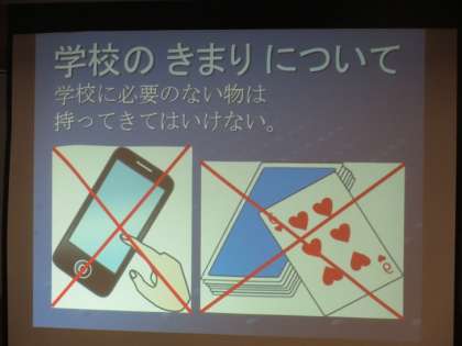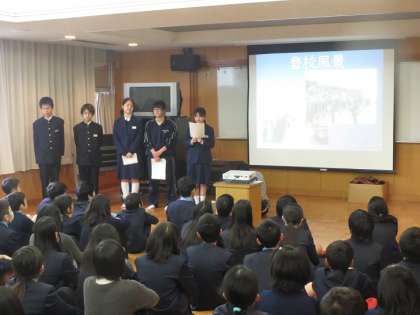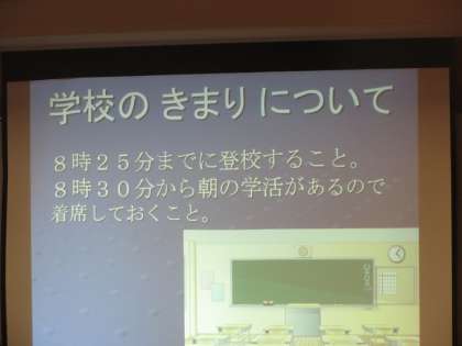 大領中学校の登校時間やさまざまな決まりについて生徒会のみなさんがていねいに説明してくれました。ご苦労様でした。