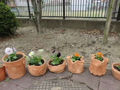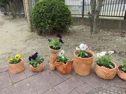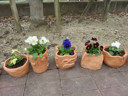 1年生が美術の授業で制作した植木鉢に花が植えられました。花が植えられると一段と立派に見えますね。