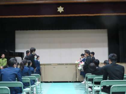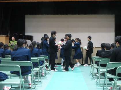 式の練習の後で、1・2年生から卒業生に卒業式で胸に飾るカーネーションのプレゼントがありました。3月11日の卒業式を迎えるばかりです。