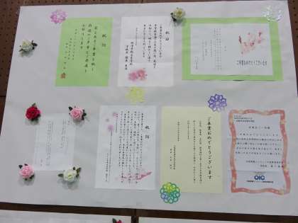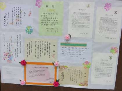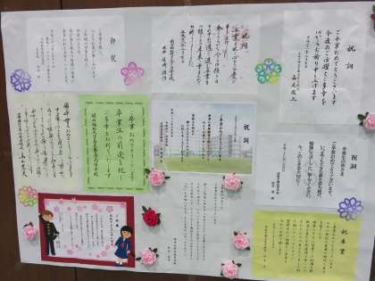 明日の卒業式の式場準備は整いました。式場の後方の壁には教育委員会をはじめとした各方面からいただいた祝詞が掲示されています。いよいよ卒業式です。開式は午前10時です。よろしくお願いします。