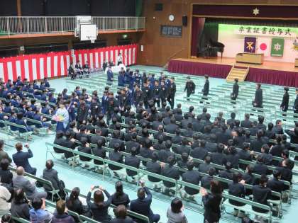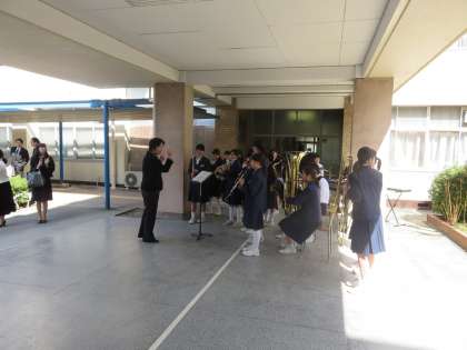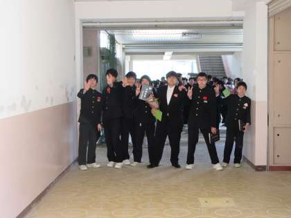 三組が最後に式場を後にしました。そして吹奏楽部の演奏に送られて、在校生や保護者のみなさんの花道を通って、いよいよ学校を後にしました。