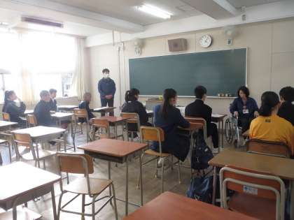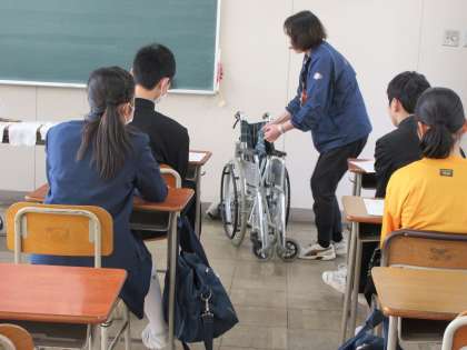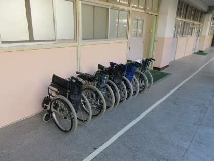 昨日は大阪市住吉区社会福祉協議会より職員の方お二人にお出でいただきまして、各学級の保健委員の生徒に車椅子の使い方についてご指導いただきました。
