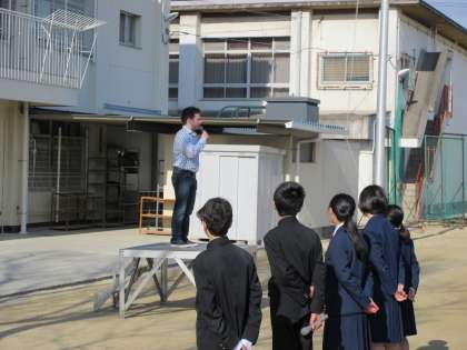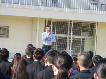 今日は今年度最後の全校集会を開催しました。金曜日ですが、今年度まで本校でC=NET(CITY NATIVE ENGLISH TEACHER)(大阪市の英語を母国語とする英語の先生)として3年間本校に勤務していただきましたギャビン先生が退任されるためお別れのご挨拶をいただきました。まず校長先生からギャビン先生の紹介があり、ギャビン先生が英語ではなく流暢な日本語であいさつされました。最後に生徒のみなさんから感謝の拍手を受けて、とても感激されていました。長い間ありがとうございました。