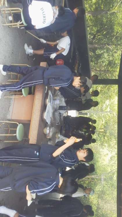 野外炊飯始まりました。煙に悪戦苦闘しています。 (10:25)