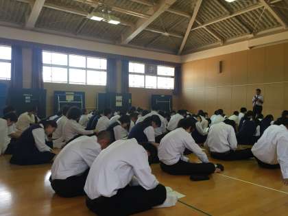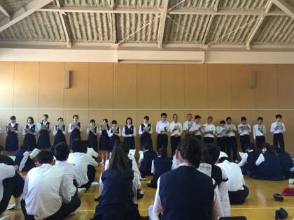 20日金曜日の6時限目に、修学旅行の時程説明を行いました。みんな集中して聞いていました。持ち物や、皆の動きを確認しました。藤原先生の説明の後、修学旅行委員が「愛唄〜38THバージョン〜」をみんなの前で披露してくれました。みんなから募った歌詞が修学旅行委員の手で原曲とは一味違ったいい歌に仕上がりました♪