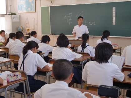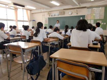 1年生2クラスを3クラスに分け、3階、1年1組、2組、3階学習室を使用し少人で授業を行いました。