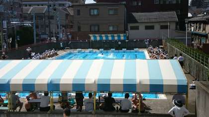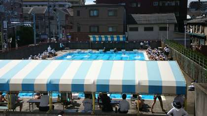 5限と6限を使って、水泳大会が行われています。生徒主体の運営の下、元気な声援が飛び交っています。