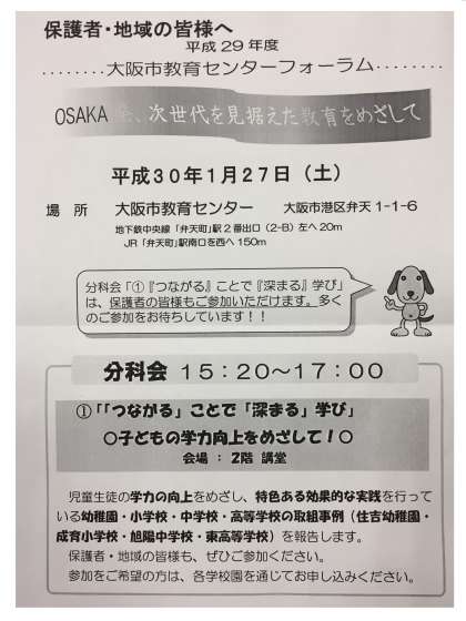 大阪市教育センターで平成30年1月27日(土)15:20〜17:00の時間帯に教育フォーラムを開催いたします。保護者の皆様もご参加いただけるフォーラムになります。ご希望がございましたら、学校(教頭)までご連絡ください。