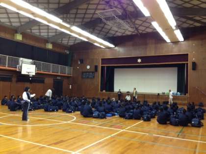 1年生は3人が体調不良などで欠席ですが、90名が貝塚の府立少年自然の家に向けて出発しました。天候が不安ですが、大縄跳び、オリエンテーリングが終わるまでは雨が降らないことを祈ります。写真は出発前の集合写真です。