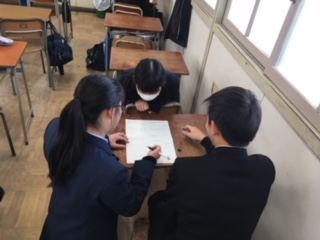 数学(図形)の授業風景です。互いに協同して教えあっています。月曜の試験に向けて、しっかり理解しましょう。