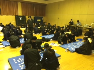 格技室にて百人一首大会です。なかなか取りに行けない班もありますが、みんな楽しそうに、そして真剣に札をとりあっていました。