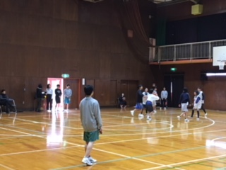写真は全体会と、体育館での男・女バスケットボール部、バドミントン部の様子です。