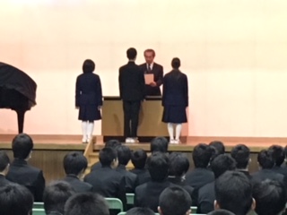 ※式練習の前に、読書冊数の表彰が行われました。読破した冊数は3年間で327冊、2年間で169冊、1年間で69冊です。感性を読書で引き続きみがきましょう。