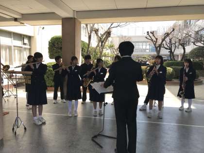保護者や来賓の皆さま、1・2年生で花道を作りました。生徒会による卒業メッセージ、吹奏楽部の演奏や、美術の自画像やパンジーが咲いている植木バチに見送られました。