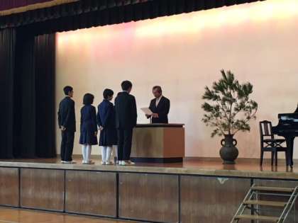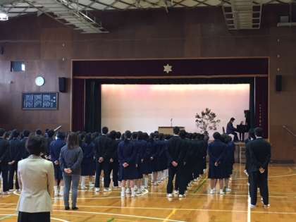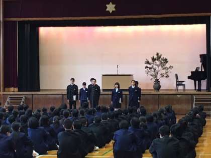 修了式は校歌斉唱から始まります。その後、平成30年度生徒会執行部の認証を行いました。新旧の生徒会執行部から挨拶を受け、年度の振り返りや新年度の抱負を聞きました。