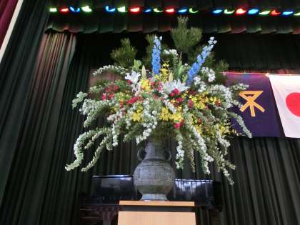 紅白幕が張られ、舞台上には豪華な花が飾られました。