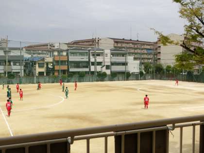 グラウンドでは、サッカー部の練習試合が行われています。