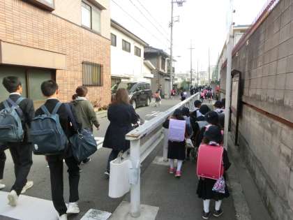 小学生も中学生も、元気よく登校しています。