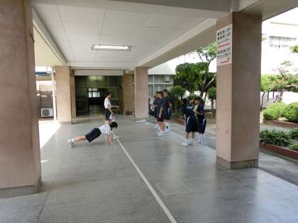 上級生は体育館で打ち合い、下級生は外で筋力トレーニングです。