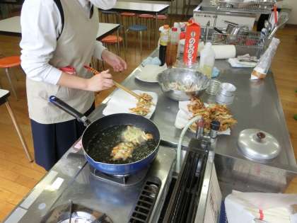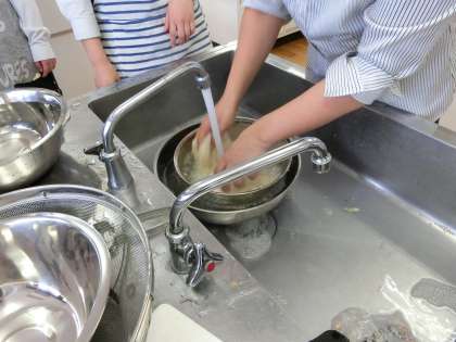 ゆであがったそうめんは、冷水で油とぬめりを取ります。