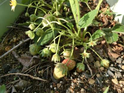 畑のイチゴ。ほんのりと赤身を帯びてきました。