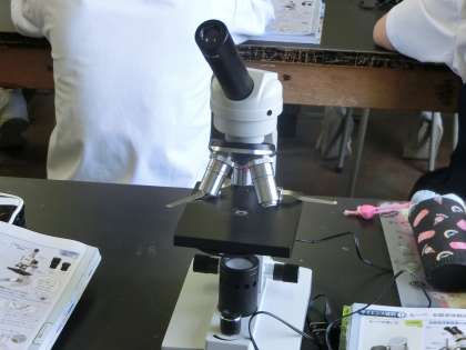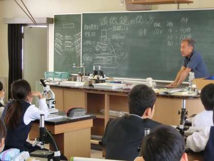 理科室で、顕微鏡の使い方です。