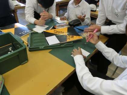 彫刻刀を使って、オリジナル作品を懸命に作っています。