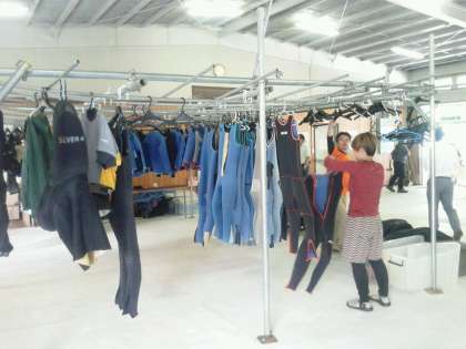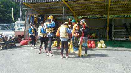 ウエットスーツ、ライフジャケット、ヘルメット、そしてパドルを手にします。