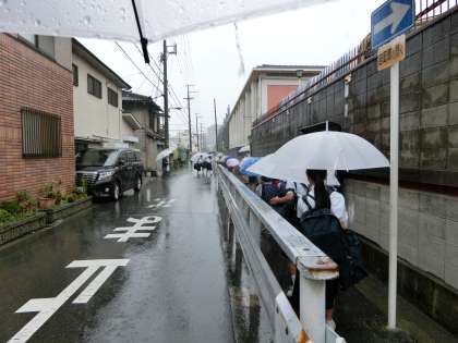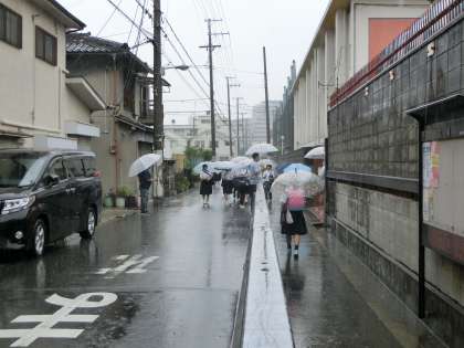 雨が激しく降る中、児童さん・生徒たちが登校しています。