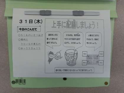 本日のメニューは、「ちくわの磯辺揚げ」「鶏肉と野菜の煮物」「あっさりキュウリ」でした。