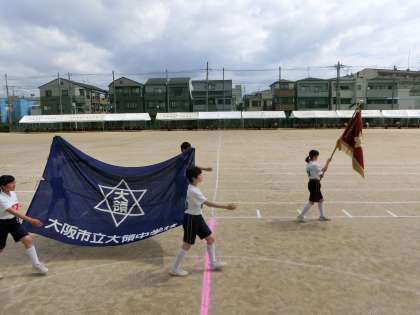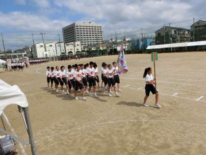 生徒会役員の諸君による校旗を先頭に、団別で入場します。