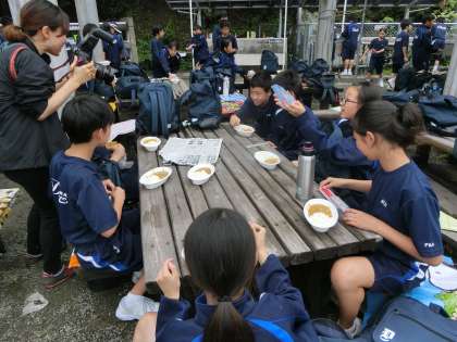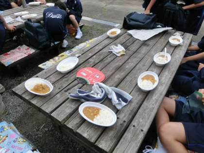 早い班は、ご飯をお皿に入れ、ルーをかけて、ついにカレーライスが完成しました。