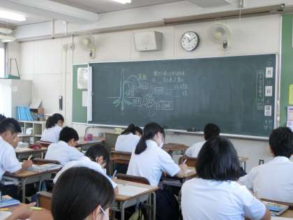 黒板に、水の吸い上げの図が描かれていました。