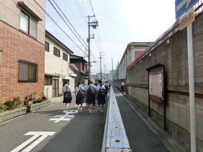 余震など地震の発生を考え、ブロック塀側をさけて登校しています。