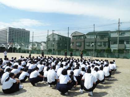 本校生徒の避難は迅速で住吉消防署の方からも「今まで数々の避難訓練を中学校でしてきたが、君らが一番だ。」とお褒めの言葉をいただきました。