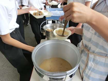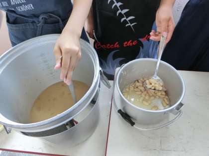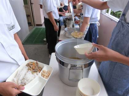 今日のメニューは、「とうがん・おくら・豆腐の味噌汁」「牛丼」「大福豆の煮もの」でした。ヨーグルト付きです。