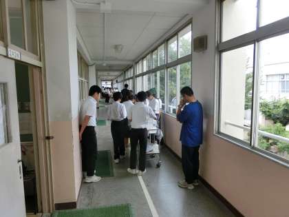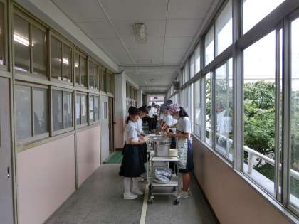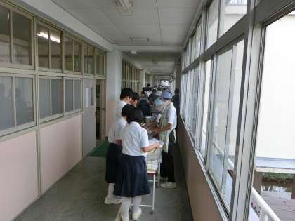 4時間目が終了し、今日も給食の配膳が始まりました。